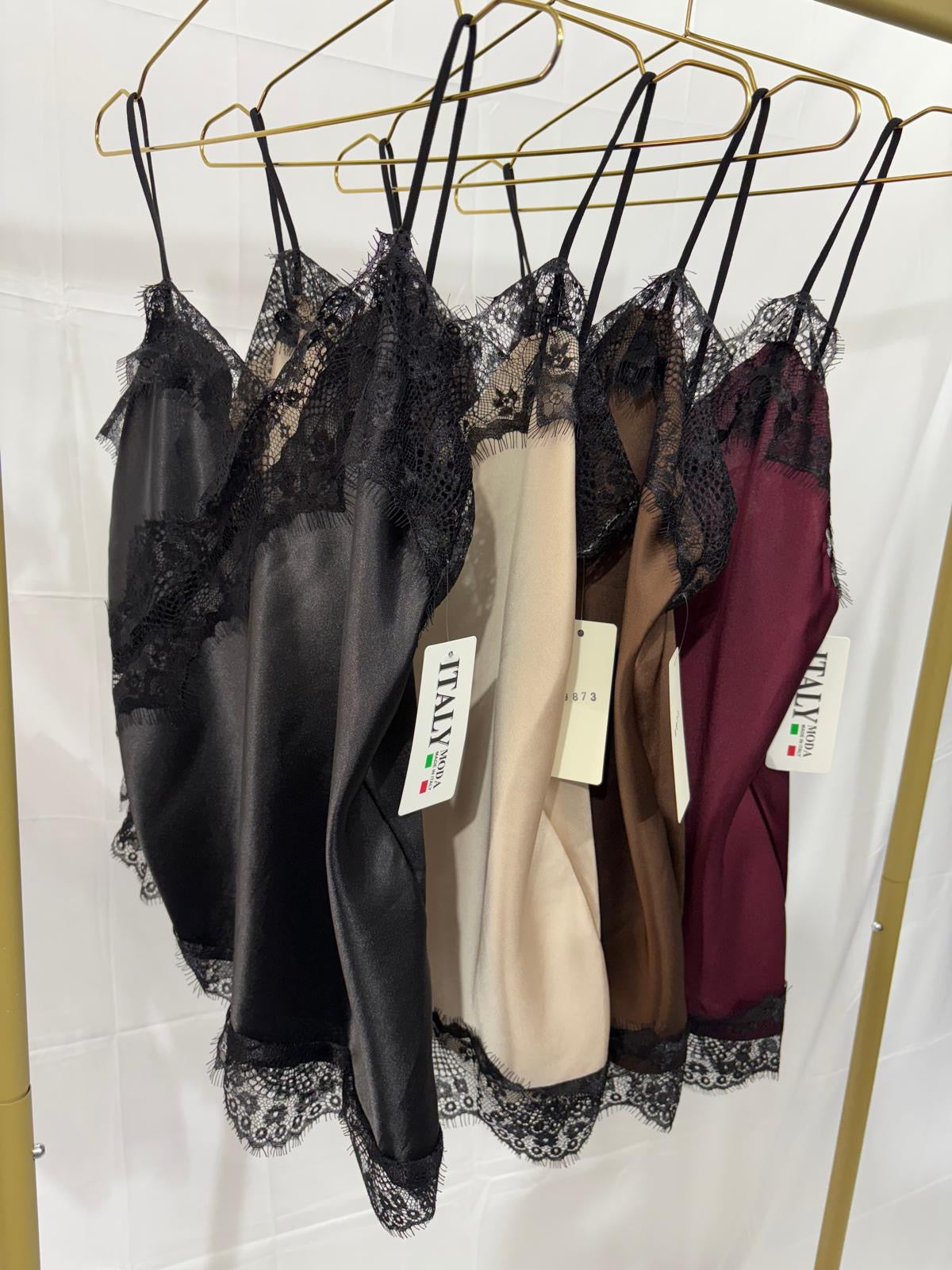 Aggiungi un tocco audace e femminile al tuo look con questo top in raso con dettagli in pizzo nero. Il modello, dal taglio lingerie, è realizzato in tessuto satinato morbido e lucente, con spalline sottili regolabili e inserti in pizzo che donano sensualità e raffinatezza.