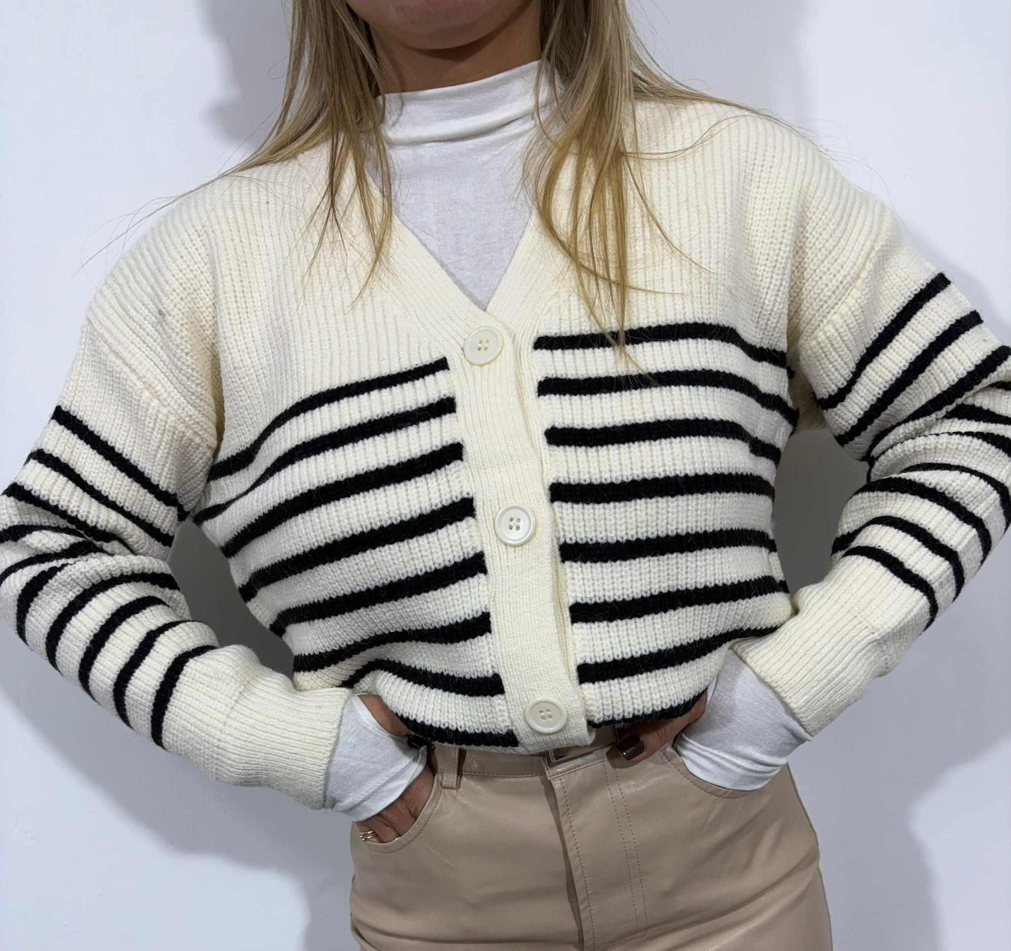 Aggiungi un tocco di eleganza casual al tuo guardaroba con questo cardigan a righe beige e panna. Realizzato in maglia morbida e calda, presenta una vestibilità leggermente oversize che garantisce comfort e stile in ogni occasione. Il design a righe orizzontali dona un look moderno e raffinato, mentre la chiusura frontale con tre bottoni ton sur ton aggiunge un dettaglio classico.