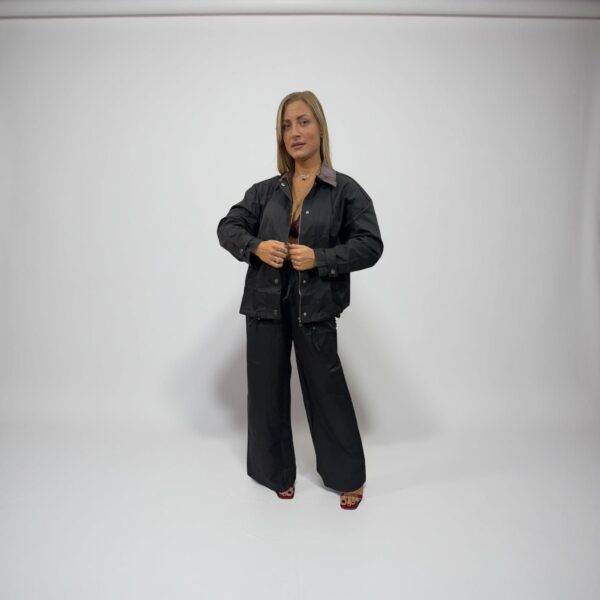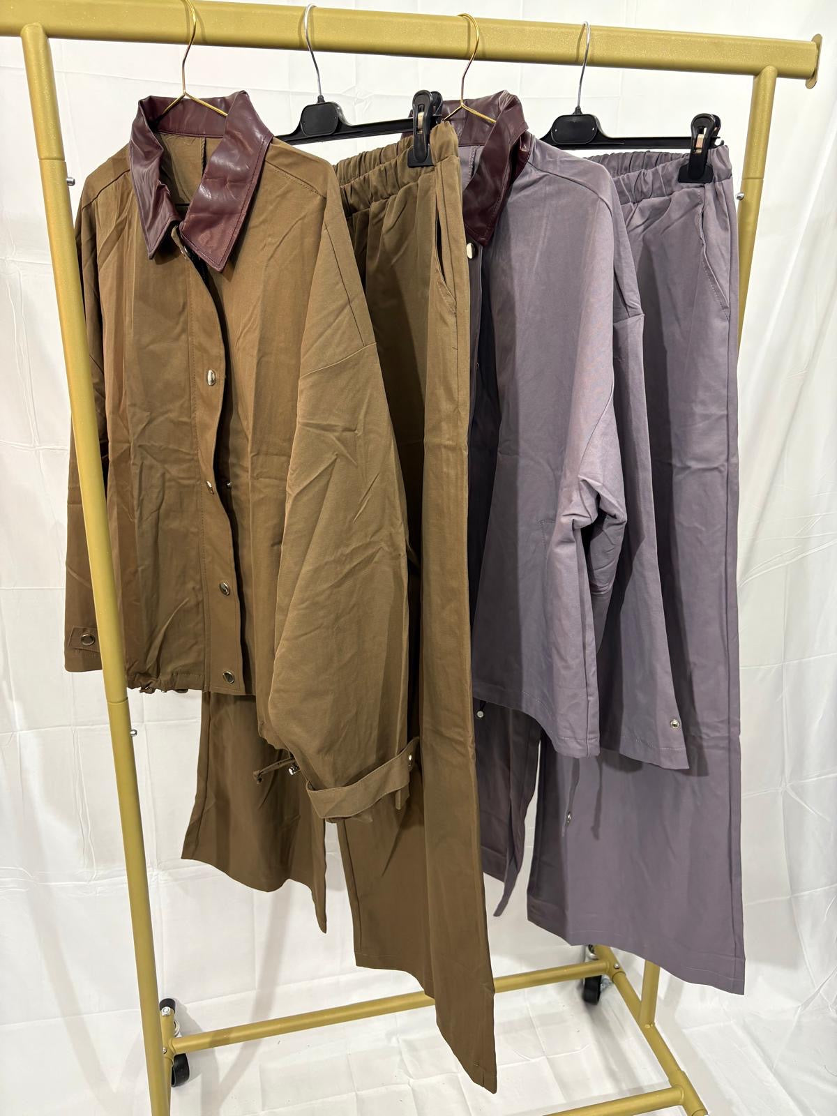Eleganza rilassata e design moderno si incontrano in questo completo coordinato, perfetto per la mezza stagione. Il set è composto da una giacca leggera con colletto in ecopelle a contrasto e da pantaloni ampi con vita elasticizzata, che garantiscono comfort e libertà di movimento senza rinunciare allo stile.