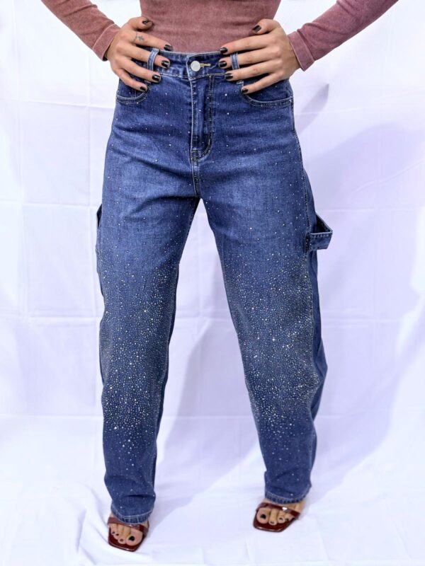 Brilla con stile con questi jeans baggy a vita media decorati da una cascata di micro strass luminosi che donano un effetto scintillante e raffinato. Realizzati in denim di cotone rigido, mantengono una struttura ampia e moderna, ideale per un look casual ma glamour.