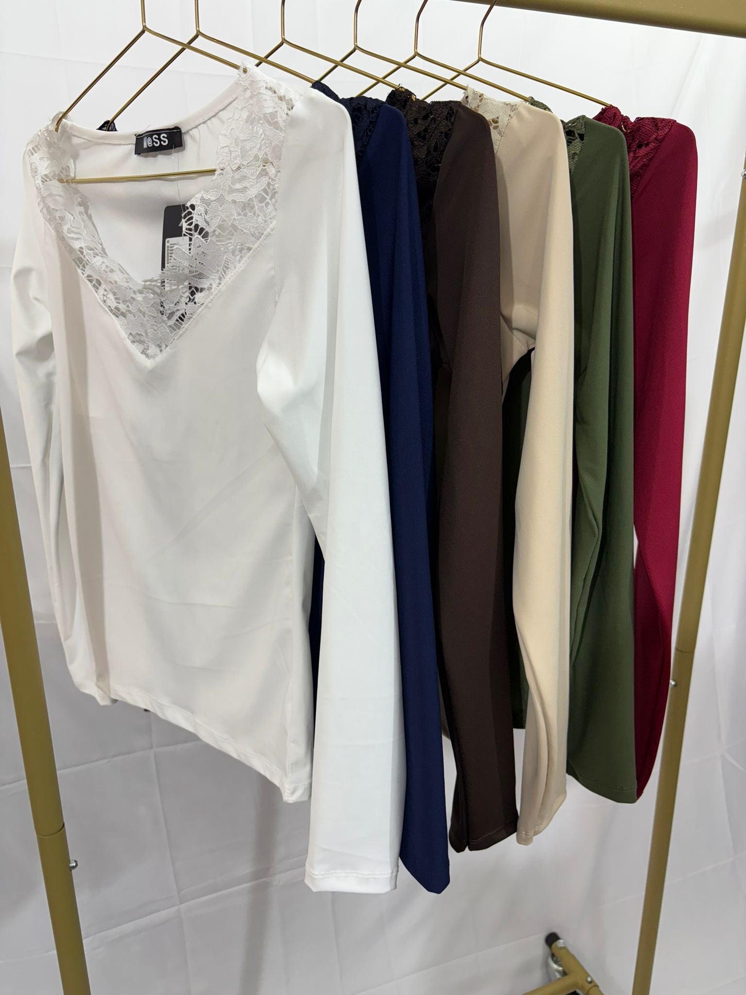 Il profondo scollo a V impreziosito da un delicato inserto in pizzo dona un allure romantico e sofisticato, ideale sia per look da sera che per abbinamenti più casual con jeans o pantaloni sartoriali.
