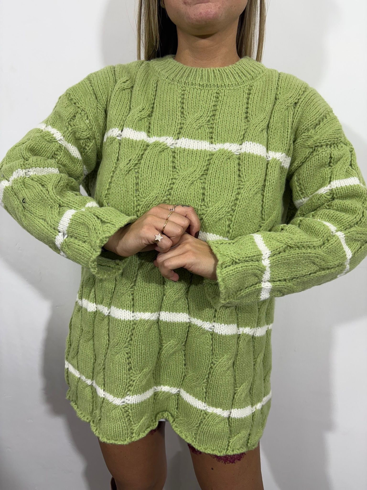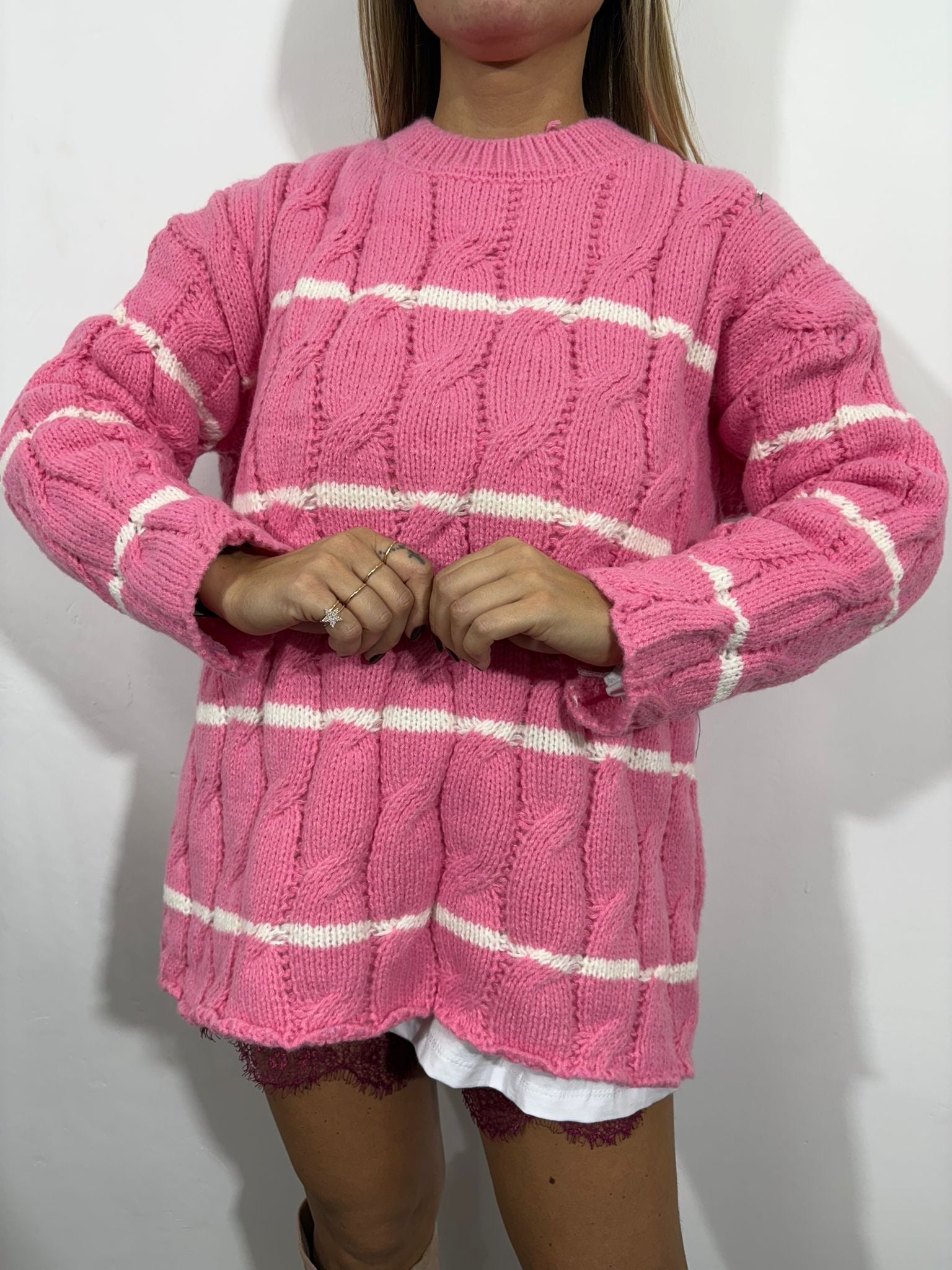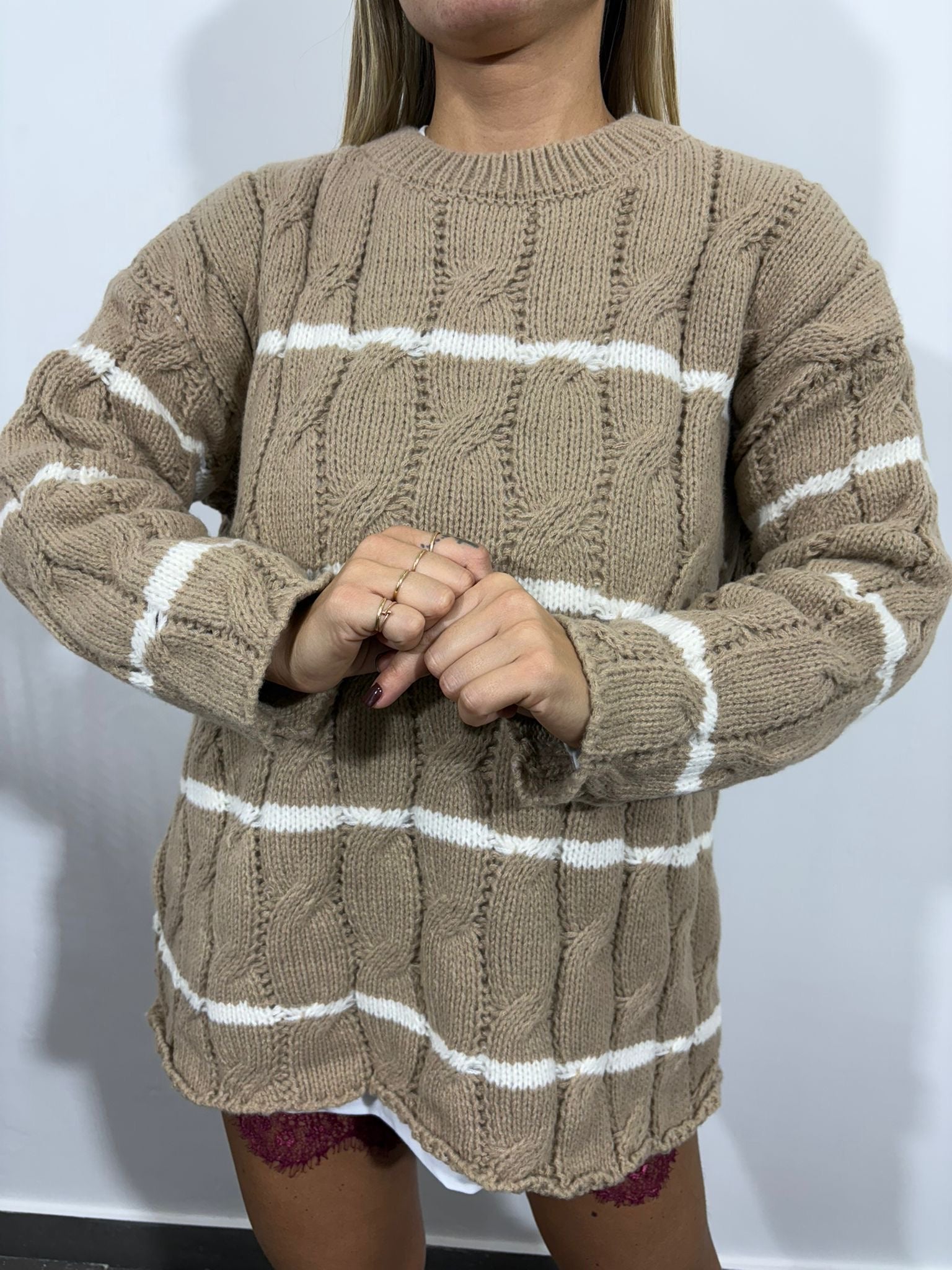 Morbido, avvolgente e dal fascino senza tempo: questo maglione panna con righe nere è il capo perfetto per affrontare la stagione fredda con stile. Realizzato in maglia grossa intrecciata, offre una vestibilità comoda e leggermente oversize che dona un look casual ma curato.